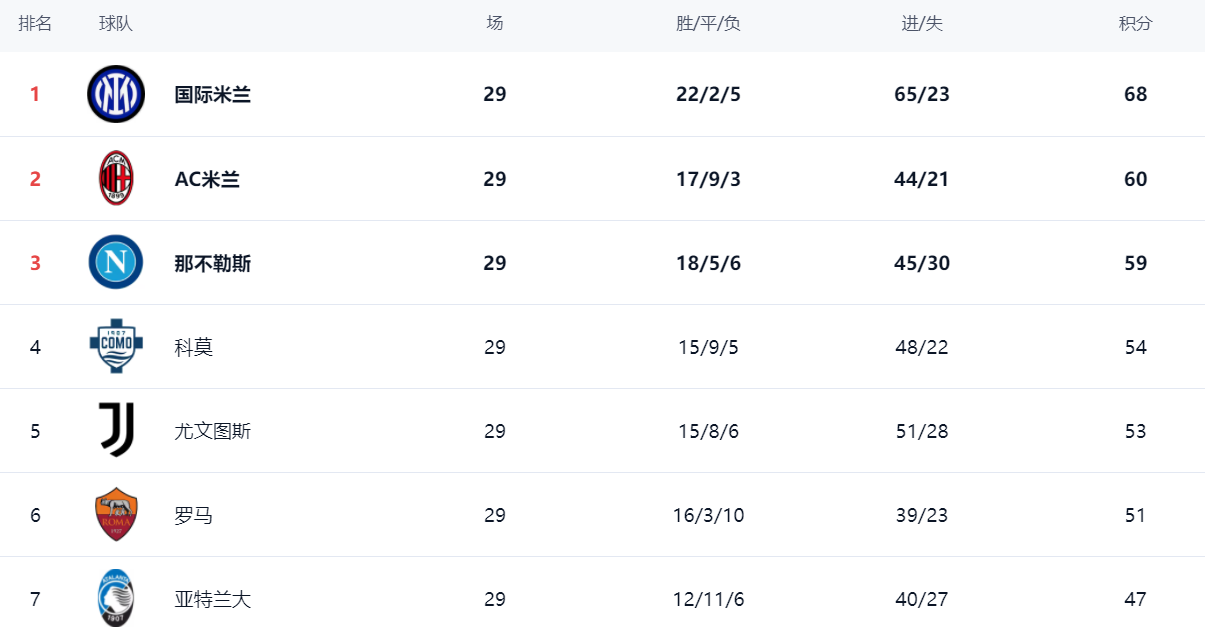 在积分榜上,国际米兰以68分占据榜首位置,战绩是22胜2平5负。这一轮国际米兰被亚特兰大逼平。本来是身后的AC米兰追分的好机会。没想到AC米兰爆冷落败,导致与国际米兰的差距变大了。AC米兰60分,落后8分!那不勒斯以59分排名第3。法布雷加斯率领科莫这匹大黑马击败罗马之后,杀入欧冠区,排名第4。尤文图斯53分,嗲到第5名。罗马掉队了,51分排名第6。